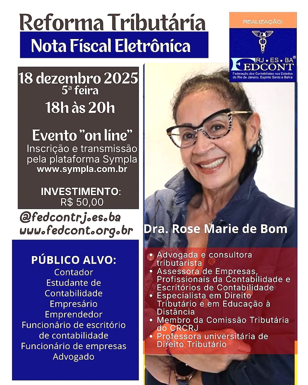 A FEDCONT RJ ES BA Federação dos Contabilistas nos Estados do Rio de Janeiro, Espírito Santo e Bahia está organizando a palestra "on line" com o tema "REFORMA TRIBUTÁRIA: Nota Fiscal Eletrônica", no dia 18 de dezembro de 2025, das 18h às 20h.